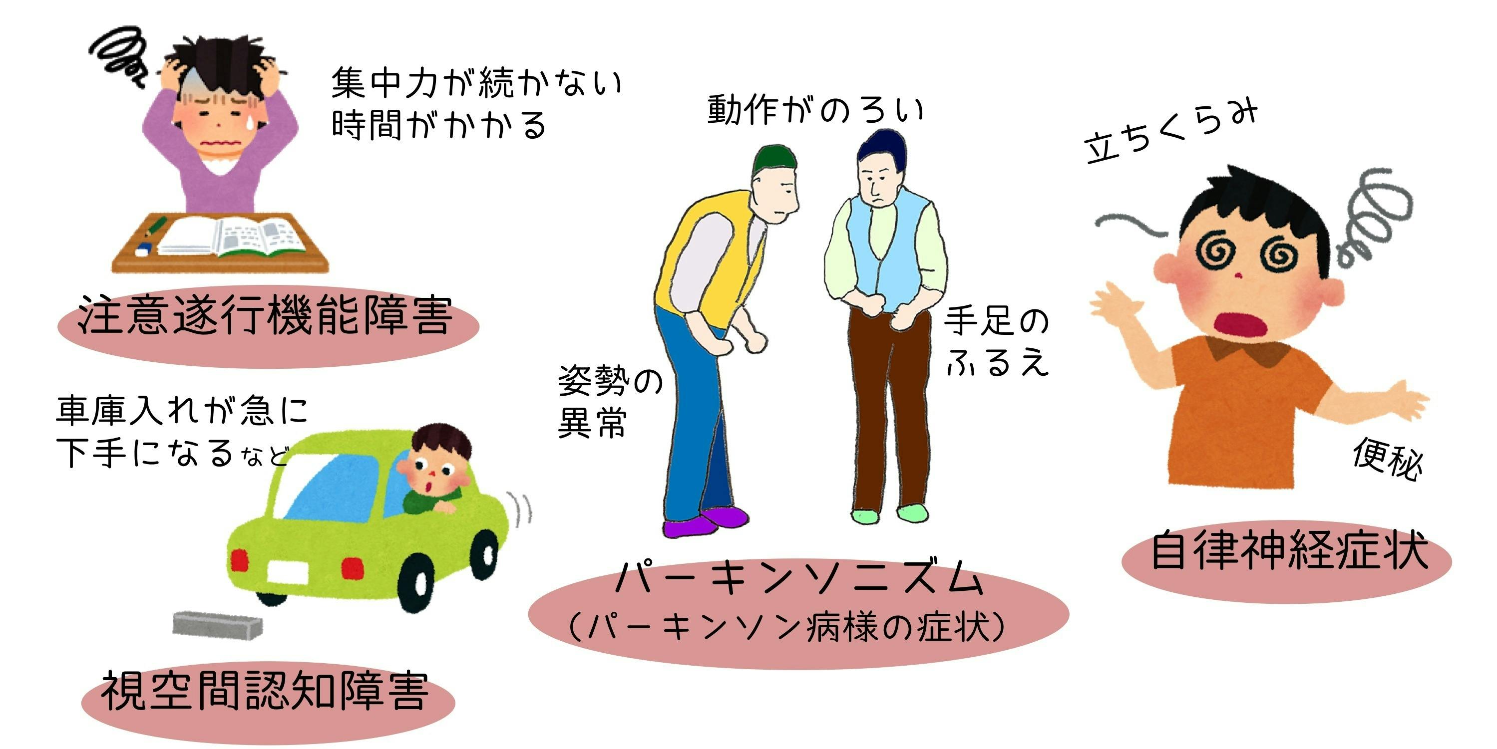 また、転びやすくなったり、手が震えたり、動きが緩慢になったりする「パーキンソン病」を同時に現れるのも特徴です。